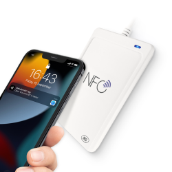 El lector NFC USB IV ACR1552U es un lector de tarjetas inteligentes compatible con CCID y PC/SC, desarrollado con tecnología sin contacto de 13,56 MHz. Este lector NFC plug-and-play cuenta con una capacidad de comunicación de alta velocidad de hasta 848 kbps y una ranura SAM integrada, lo que proporciona altos niveles de seguridad y fiabilidad para aplicaciones exigentes de tarjetas inteligentes.