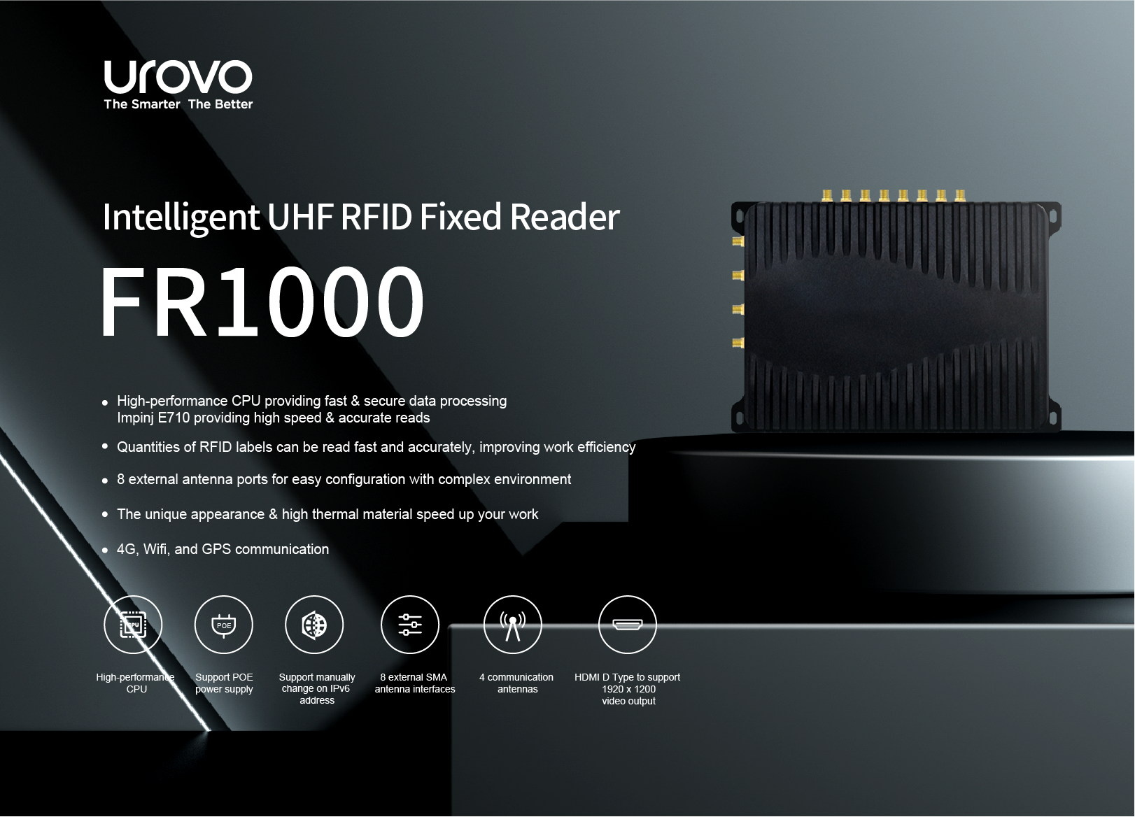 El FR1000 es un lector RFID fijo programable avanzado, diseñado para aplicaciones en diversos sectores. Este lector UHF ofrece un alto rendimiento y fiabilidad al leer etiquetas RFID. El FR1000 está equipado con una antena 4G externa para una amplia conectividad, así como con una antena Wi-Fi externa para una comunicación inalámbrica fluida. También integra un módulo GPS externo para un seguimiento preciso de la ubicación.