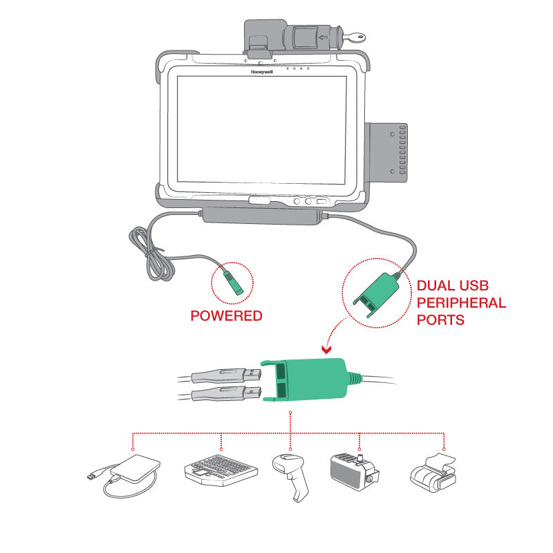 Base de carga RAM Mounts para tabletas Honeywell RT10: bloqueable (con llave), entrada jack de 5,5 mm, salida USB-A dual, montaje VESA 75x75